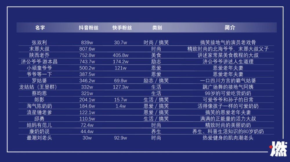 下图是据燃财经(ID:rancaijing)不完全统计的抖音快手上的老年网红,人气最高的末那大叔(北海爷爷父子)粉丝已经超过800万。