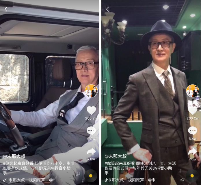 这类网红以@末那大叔(北海爷爷)为代表,举手投足间都是藏不住的精致优雅。74岁的爷爷西装革履、站得笔挺,用实际行动证明了他所说的:“生活要有仪式感,与年龄无关。”