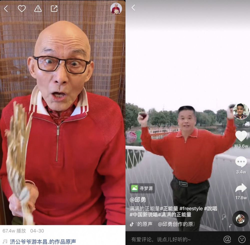 深入人心的老演员@济公爷爷 在快手抖音上也狂吸了一波粉,草扇一摇,他嘴里讲出来的人生哲理就更可信了十分;口喊“满满的正能量”的阳光大爷@邱勇 ,也因为励志+搞笑斩获了一批粉丝。