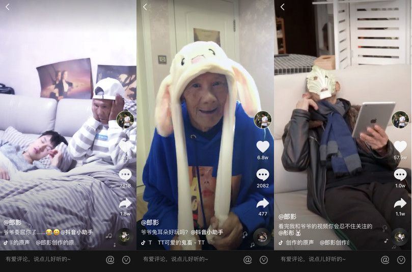 来自成都的青年编导郎影5年前就开始在微视上做搞笑类的短视频,但一直没火起来。后来入驻抖音,无意间拍了一个爷爷的视频,一下子就有了4000多的播放量。这让他看到了火的希望,随即把拍摄重心放在自己83岁的爷爷身上。