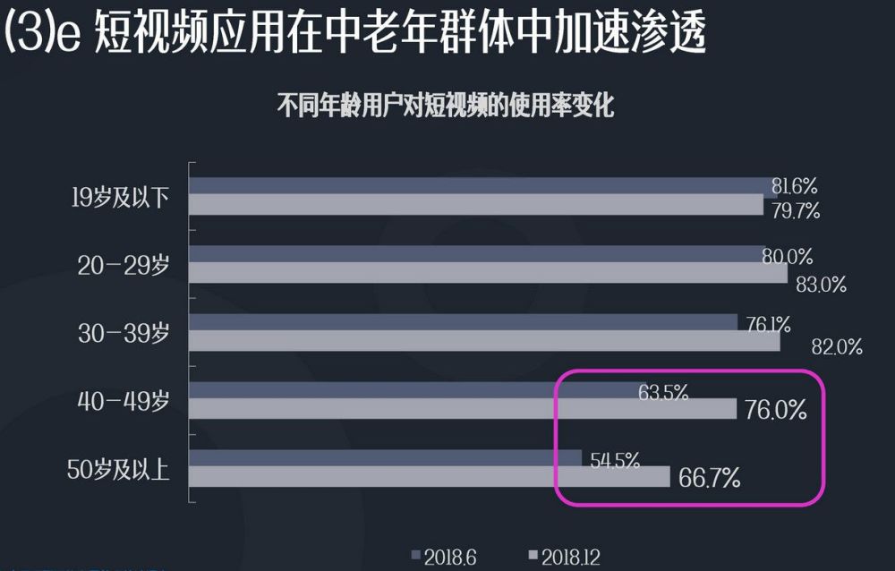 据《2019中国网络视听发展研究报告》,根据2018年中、年底数据对比,40岁以上用户对短视频应用的使用率在半年内提升了12%,中老年网民群体增长迅速。