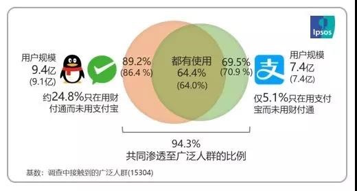 全球知名市场研究机构益普索日前也发布了《2019第一季度第三方移动支付用户研究报告》。报告显示,腾讯金融旗下财付通(包括微信支付和QQ钱包)和支付宝的用户渗透率分别为89.2%和69.5%。按交易笔数计,财付通市场份额为51%,支付宝为41%。