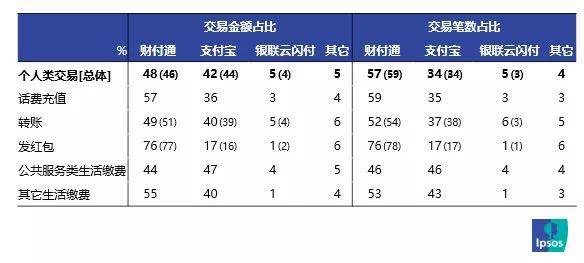 凭借在社交领域的强势地位,财付通继续在转账、红包、话费充值、公共服务类缴费等个人类交易场景中占据整体优势。以交易金额和笔数计,财付通在个人类交易场景的市场份额分别为48%和57%,支付宝分别为42%和34%。