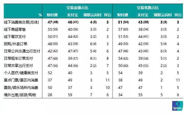 报告还发现,在零售、餐饮、外卖、出行等线下消费类交易场景中,财付通交易金额和笔数占比分别为47%和51%,也保持着领先优势,支付宝占比分别为46%和43%。
