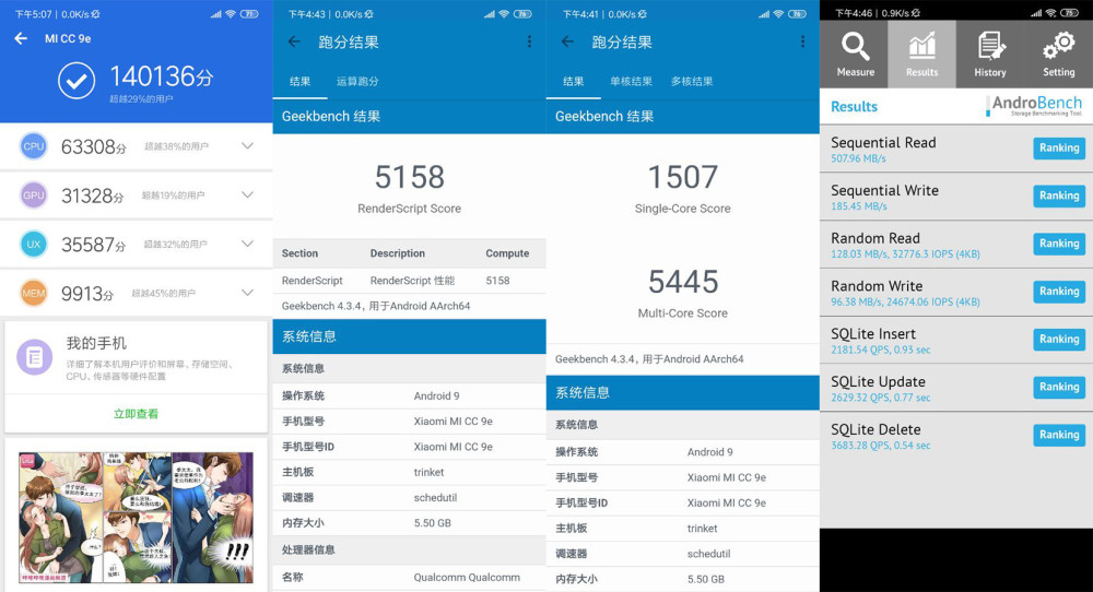 另外,CC9e搭载了LPDDR4x内存和UFS 2.1闪存,也是同价位中很亮眼的配置。经Androbench测试,随机读取速度达到127.58MB/s,写入速度达到99.23MB/s,这个成绩已经与不少旗舰手机接近。