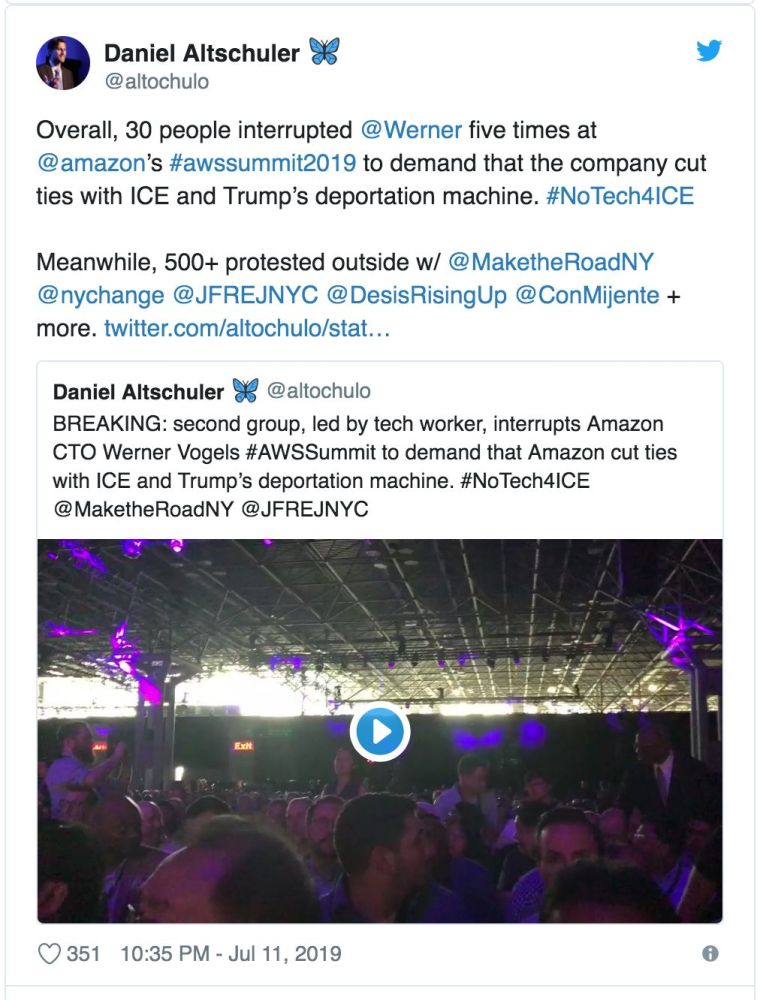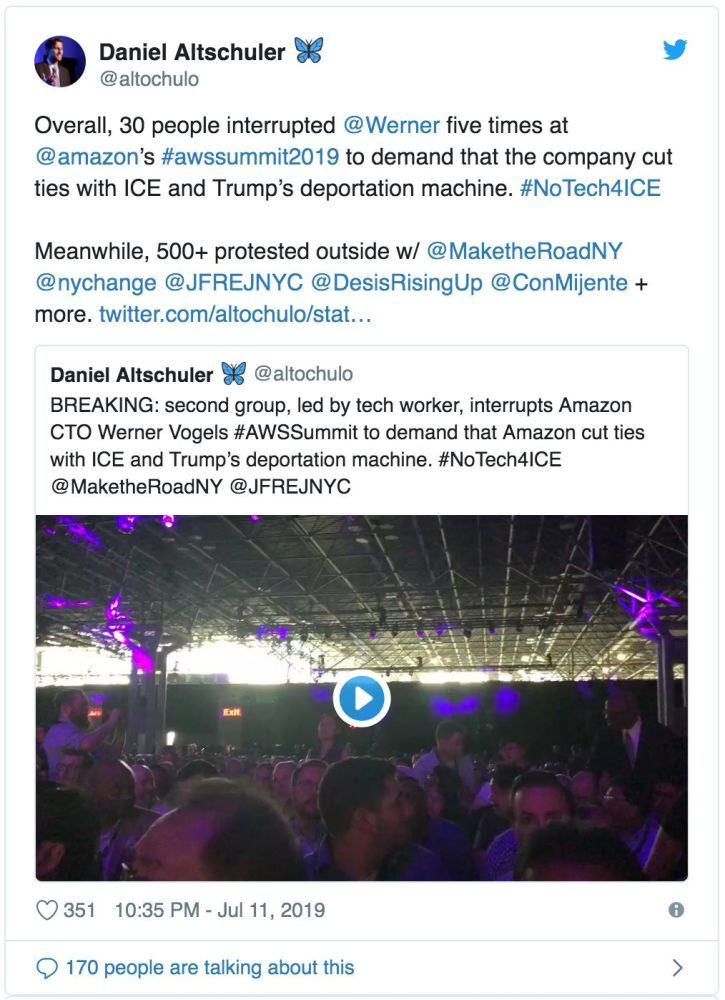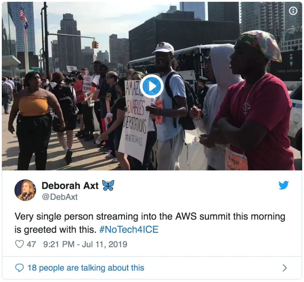 员工在公司内部抗议时,一群示威者打断了亚马逊年度AWS峰会的主题演讲,其中包括Mijente和Jews for Racial and Economic Justice等支持移民的组织。据活动积极人士声称,500多人也在外面举行抗议活动。
