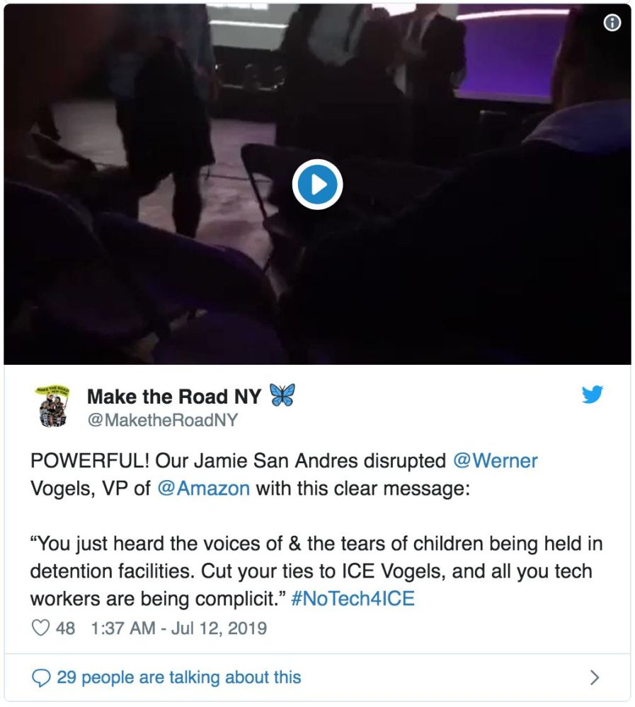 一名抗议者喊道:“你们刚刚听到了被关押在拘留营中的孩子们的哭喊声。断绝AWS与ICE的关系,你们的所有技术员工都是同谋。”