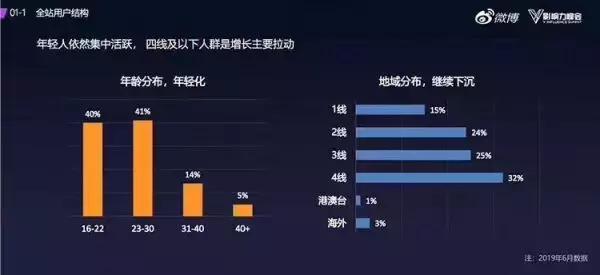 与此同时,微博还聚集了体量庞大的年轻人,数据上看16至22岁、22至30岁的用户分别占微博的活跃用户的40%,这一人群热爱追逐新奇事物、活跃度和消费能力都极强,对于微博上热点事件的生成、传播都贡献出了作为主力的强大力量。这一人群的存在同样也影响着头部作者的活跃性,目前微博头部作者整体规模达78万,活跃粉丝大于50万的大V博主已接近6万个账号。