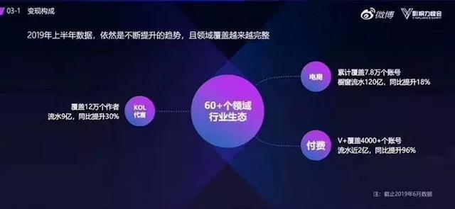 根据V影响力峰会上微博高级副总裁曹增辉的介绍,今年上半年这三种变现方式均处于不断提升的趋势,且领域覆盖越来越完整。