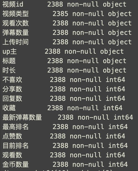 为了得到“转评赞”数据,我还以视频id里面的数字(去掉“av”)为索引,遍历访问了每个视频页面获取了更详细的数据,最终得到以下字段: