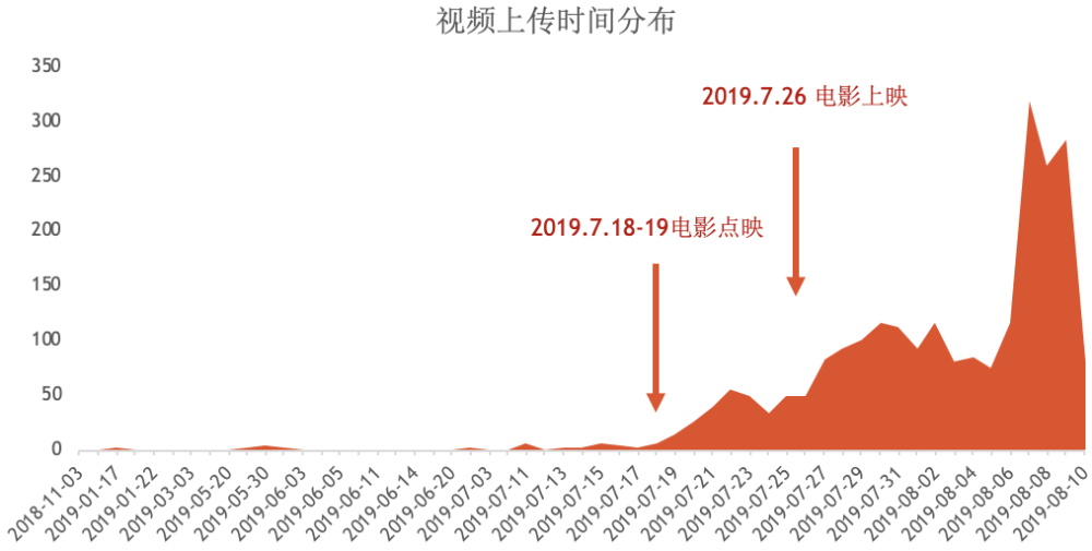 电影在7月18、19日就进行了全国范围的点映,正式上映时间为7月26日,在这之后相关视频数量有明显的上升。