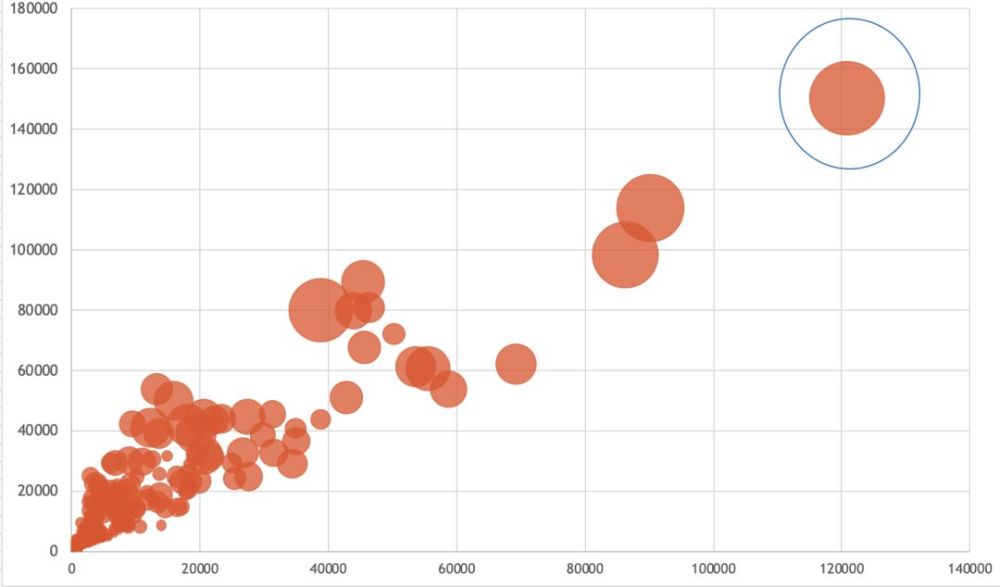 注:横坐标代表点赞数量,纵坐标代表收藏数量,气泡大小表示金币数量。