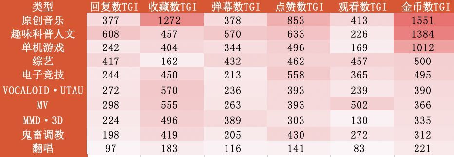 按照金币数TGI排序,我们发现“原创音乐”以1551的超高指数占据榜首,“趣味科普人文”虽然视频数量占比不高,但是用户的投币数量还是很可观的。