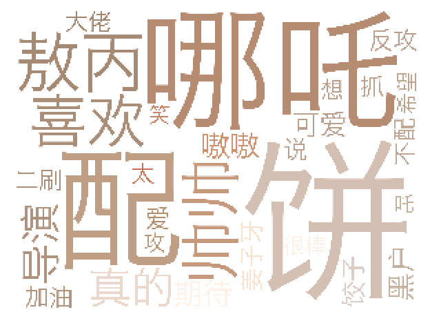 毫无疑问,“哪吒”和“敖丙”作为影片两大主角是视频的主要人物;因为他们同生共患难的情谊,“藕饼”(“哪吒+敖丙”组合)也是视频的关键词;除此之外,“国漫”也是一大主题词,毕竟我们这次是真正地被我们的国产动漫震撼到了。