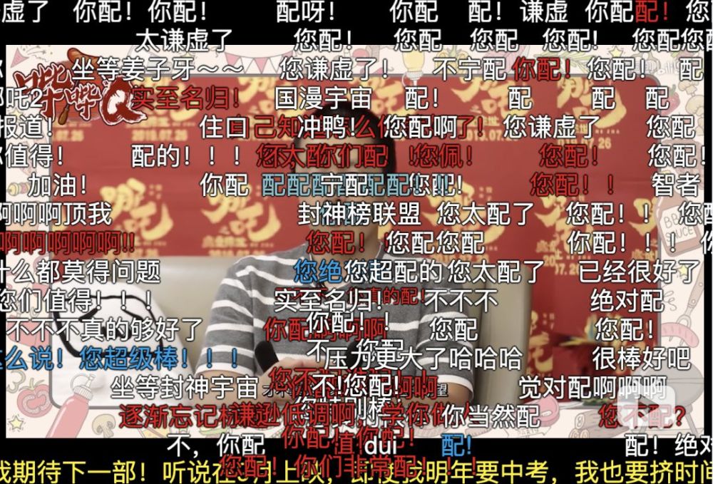 视频中导演饺子非常谦虚,说“觉得我们现在还不配得到那么多粉丝”,满屏“配”字表明了大家最硬核的支持。