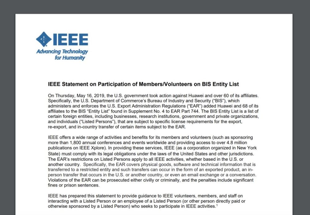 据科技新闻网站 The Register 报道,当地时间 5 月 26 日,IEEE 802 LAN/MAN 标准委员会主席 Paul Nikolich 向该执行委员会的成员发布了一封邮件,值得注意的是,邮件里附了一份名为IEEE Statement on Participation of Members/Volunteers on BIS Entity List的关键附件。这个发布于 22 日的附件提到,由于 IEEE 是注册在纽约的法人,所以所有被列入黑名单的实体也将受到 EAR 的限制。另外,EAR 涵盖了物品、软件和技术信息的转移,转移的形式可以是出口商品,人员间的接触转移(不管是发生美国国内还是其它国家),甚至是邮件交流和交谈,而违反该条例则可能面临民事或刑事诉讼。