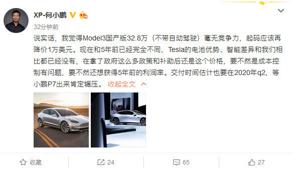 钛媒体5月31日消息,特斯拉在今日公布Model 3标准续航升级版(特斯拉中国)起售价。随后,小鹏汽车董事长何小鹏在微博上发表评论,称Model3国产版32.8万(不带自动驾驶)毫无竞争力,起码应该再降价1万美元。
