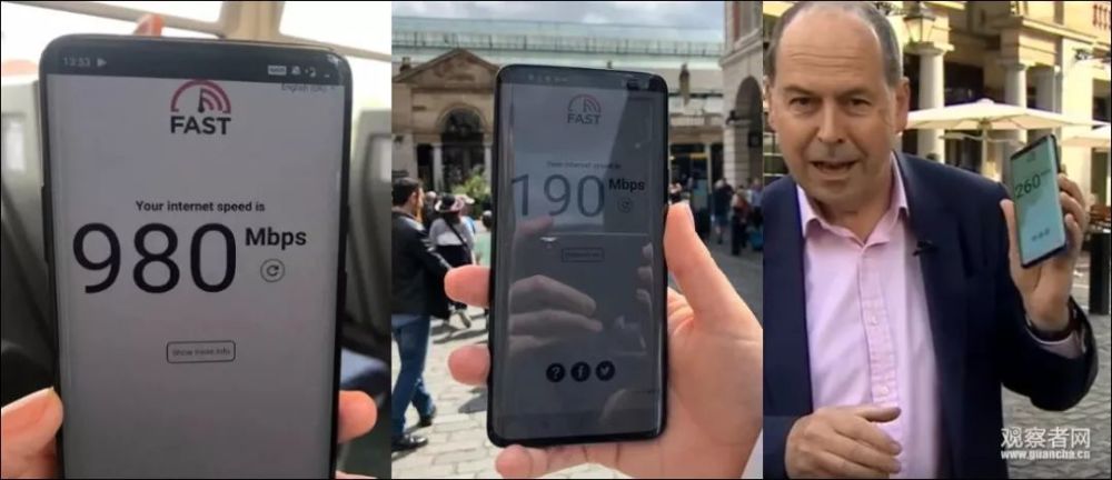 现阶段英国5G网速预测为4G的5倍,而The Verge新闻网实际测速下来,不同的地域信号不同,从190Mbps到980Mbps不等。罗里・赛伦-琼斯所在地区测速为260Mbps。