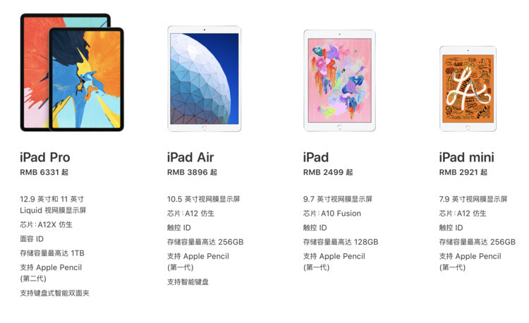如今不同价位但功能近似的 iPad 产品线 | 苹果官网截图