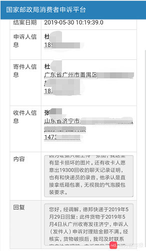 5月18日,杜先生在国家邮政局消费者申诉平台上进行申诉。几天后,德邦快递继续回应称,“为了维护客户,我司愿将理赔金额提高至740元,申诉人坚持索赔19300元,对此我司无法满足。”