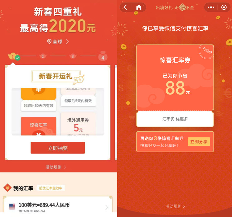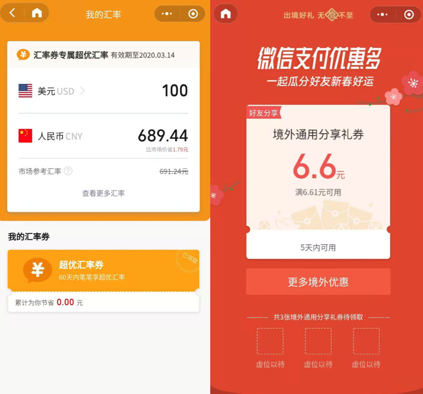用户领取礼券后,在境外线下门店消费使用微信支付时将自动享受优惠,更有可能随机获得惊喜汇率。用户亦可将礼券分享,让好友获得同等价值的优惠礼包。