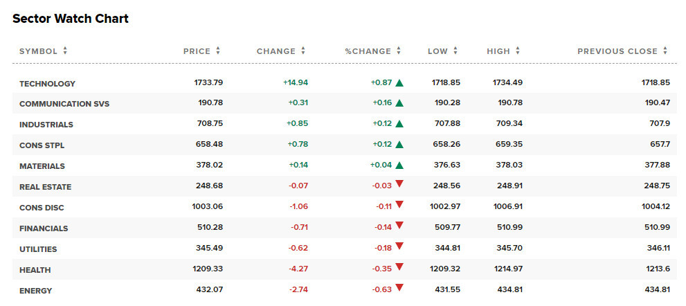 标普500指数11大板块中五个上涨,6个下跌,科技股领涨,能源股领跌。