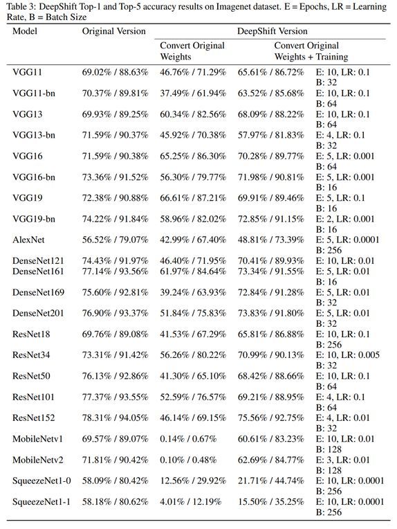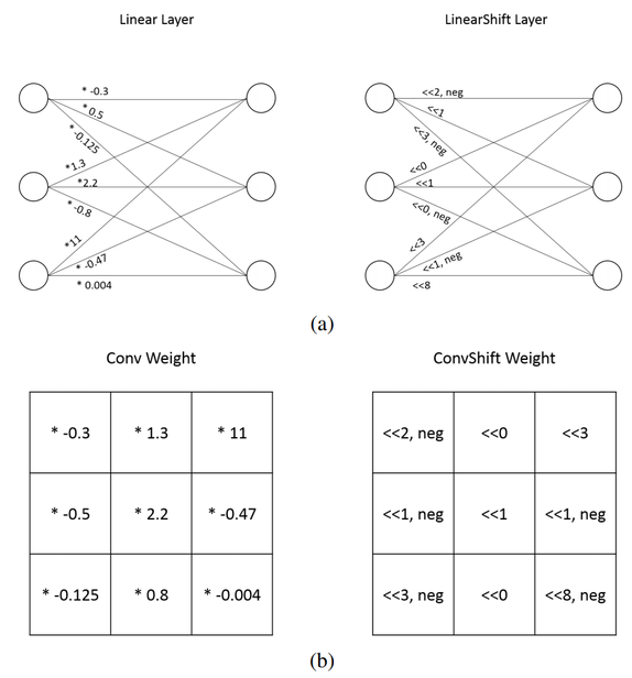 华为的这篇论文提出了解决该问题的新方法,即引入两种新型运算:卷积移位(convolutional shift)和全连接移位(fully-connected shift),从而用按位移位(bitwise shift)和按位取反(bitwise negation)来取代乘法。使用了卷积移位和全连接移位的神经网络架构族即 DeepShift 模型。DeepShift 模型可以在不使用乘法的情况下实现,且在 CIFAR10 数据集上获得了高达 93.6% 的准确率,在 ImageNet 数据集上获得了 70.9%/90.13% 的 Top-1/Top-5 准确率。