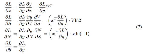 为了帮助推导后向传播,研究者使用项 V = ( 1)^round(N) �B (2)^round(S),得到: