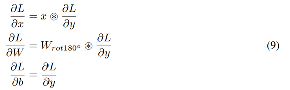 其中 W 的维度是 c_out × c_in × h × w,其中 c_in 是输入通道大小,c_out 是输出通道大小,h 和 w 分别是卷积滤波器的高和宽。LeCun 等 [1999] 将卷积的反向传播表示为: