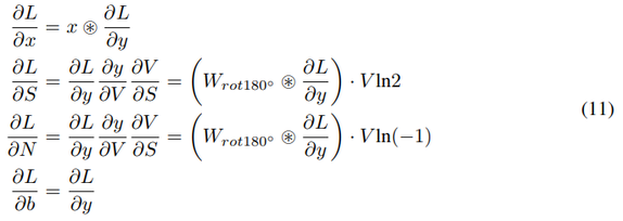 其中 N 和 S 分别表示取反和移位矩阵,维度为 c_out × c_in × h × w。类似地,为了推导反向传播,研究者使用项 V = ( 1)^round(N) �B (2)^round(S),得到:
