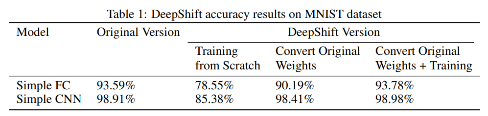 下表 1 展示了模型在 MNIST 验证集上的准确率。我们可以看到,从头训练得到的 DeepShift 模型的准确率下降程度超过 13%,不过仅转换预训练权重得到的 DeepShift 版本准确率下降程度较小,而基于转换权重进行后续训练则使验证准确率有所提升,甚至超过了原版模型的准确率。