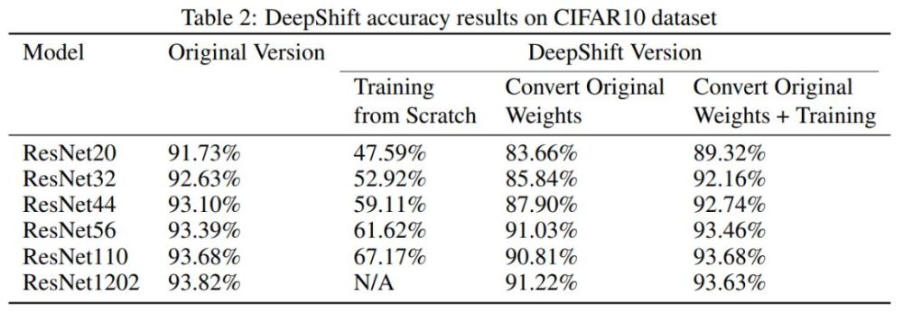下表 2 展示了模型在 CIFAR10 验证集上的评估结果。我们注意到从头训练得到的 DeepShift 版本出现了严重的准确率下降,而基于转换预训练权重训练得到的 DeepShift 模型准确率下降幅度较小(不到 2%)。
