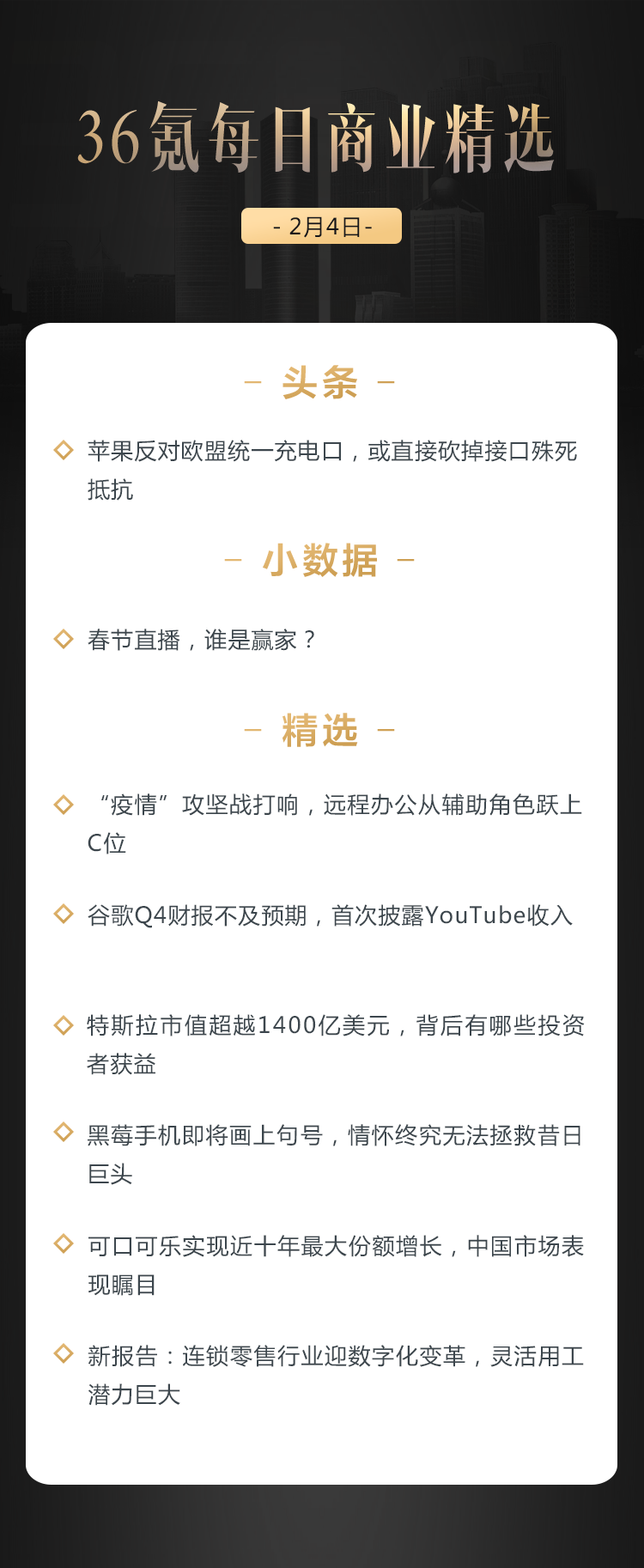 本文来自36氪付费栏目《36氪每日商业精选》――2月4日