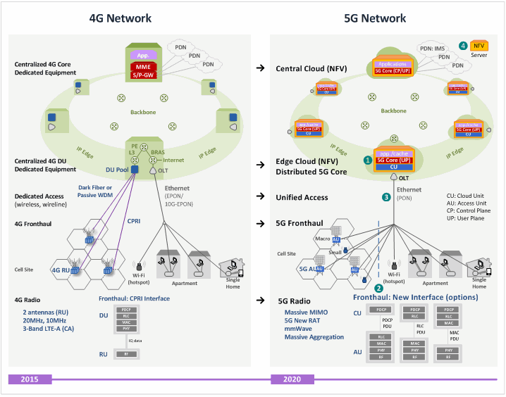 为了应对5G的三大服务类型(超大宽带数据,超多IOT设备接入数量和超低延迟),整个5G网络设备的功能都以这三种服务做了虚拟“切片”,每个设备用对应的软件来完成对应的“切片”功能。这些“切片”也延伸到了基站上。这导致5G基站的功能比4G更为复杂。